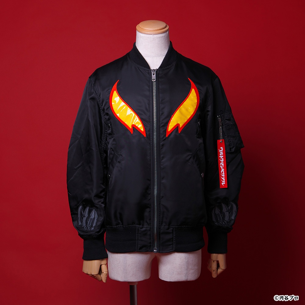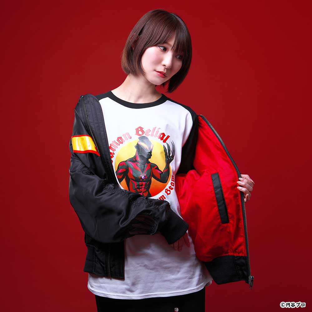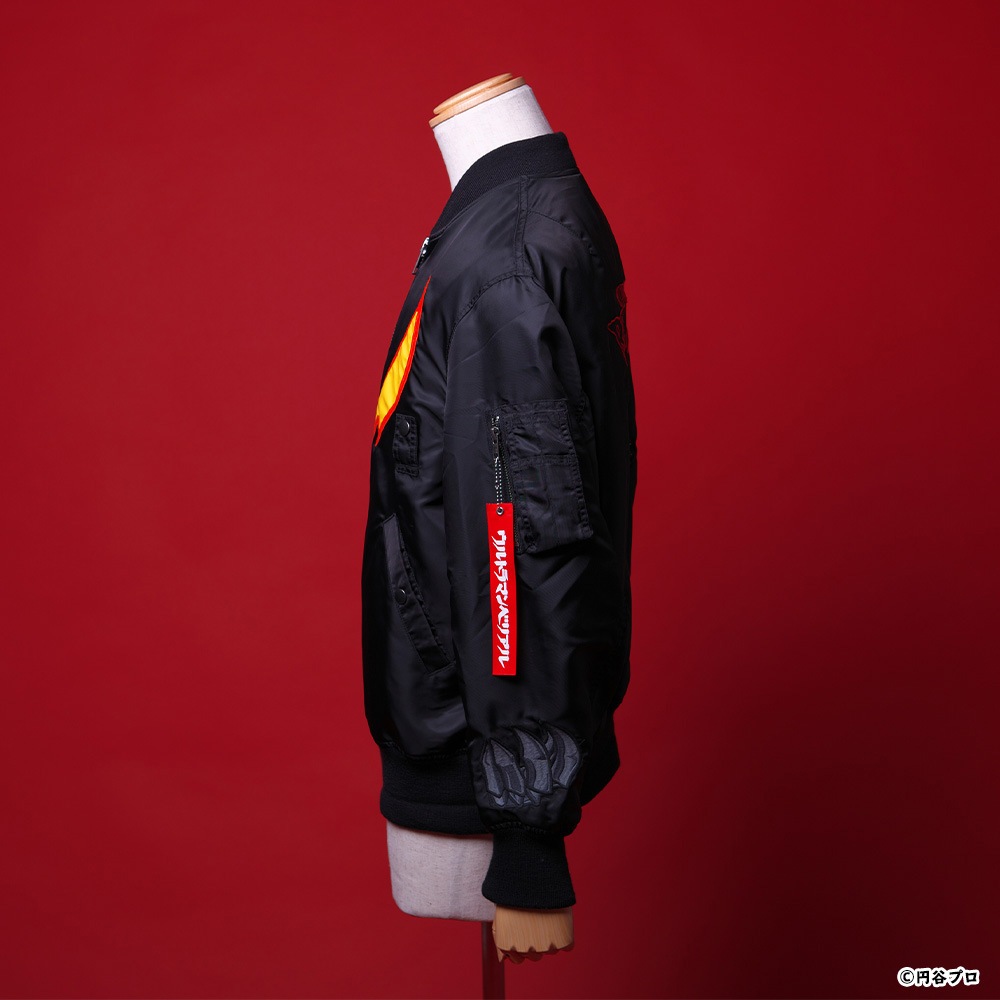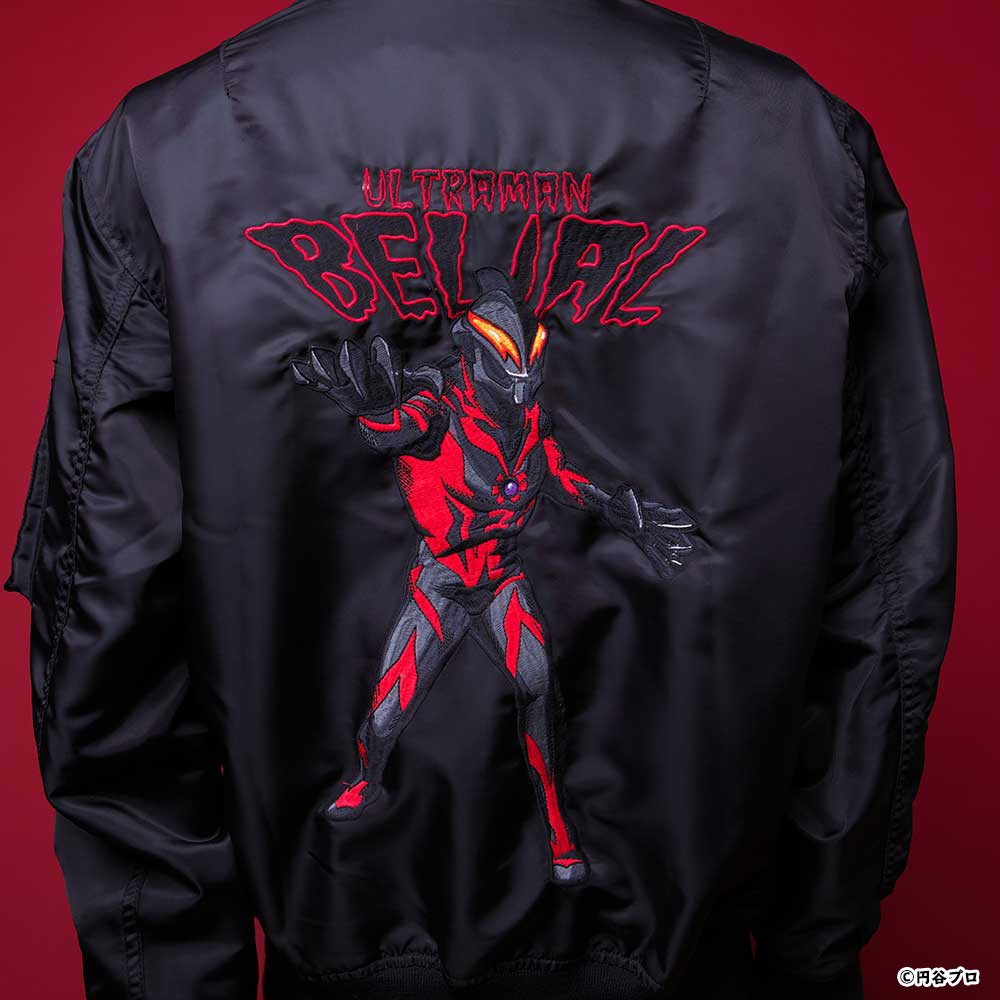 「ウルトラマンベリアル」のモチーフが目を引くMA-1が登場! 柄は総刺繍でインパクトも抜群!フロントの「ウルトラマンベリアル」の目のモチーフのインパクトが◎!! 袖口の爪のような手のモチーフも最高にかっこいい!見どころ満載の一着となっております。 男性・女性どちらでもご着用いただけます。
